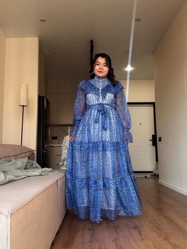 Синее платье с орнаментом в казахском стиле. Шикарное качество, одевалось 1 раз. Очень красиво смотрится. На рост от 165. Размер 46-48. Артикул: 598794