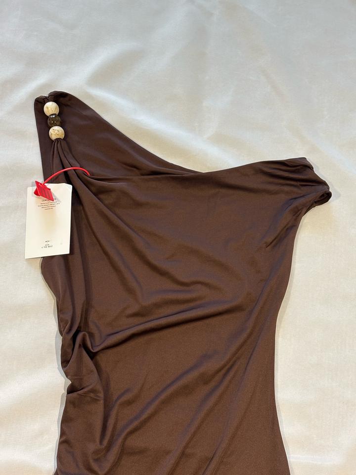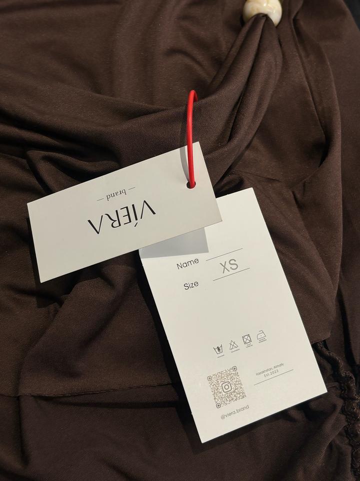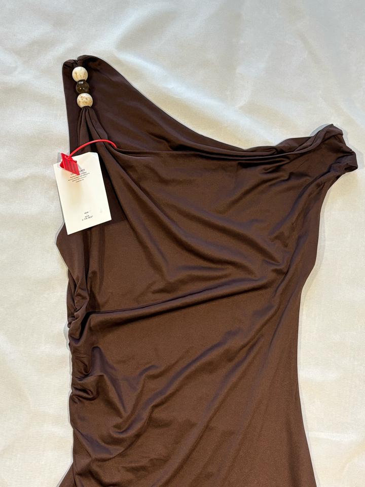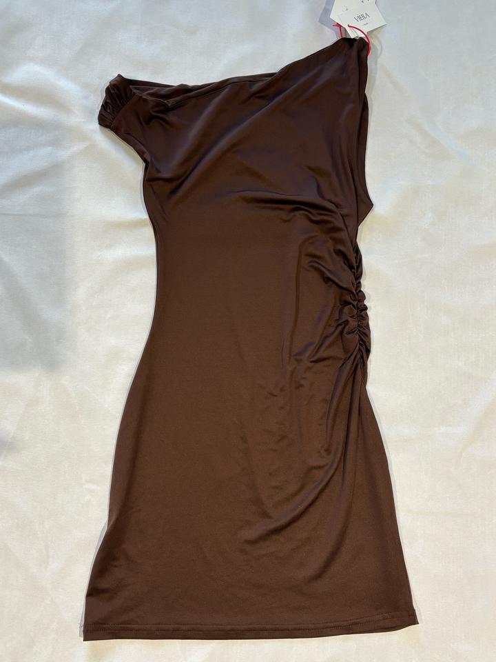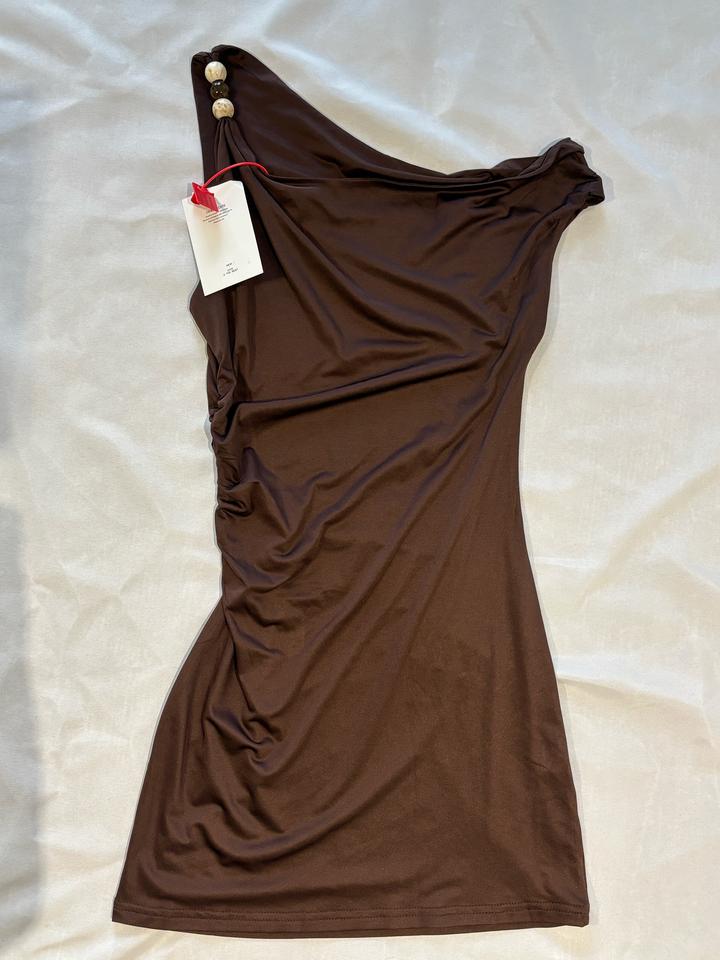 Мини платье коричневого цвета, с асимметричным верхом, сборкой ткани сбоку Состояние новое Артикул: 599159