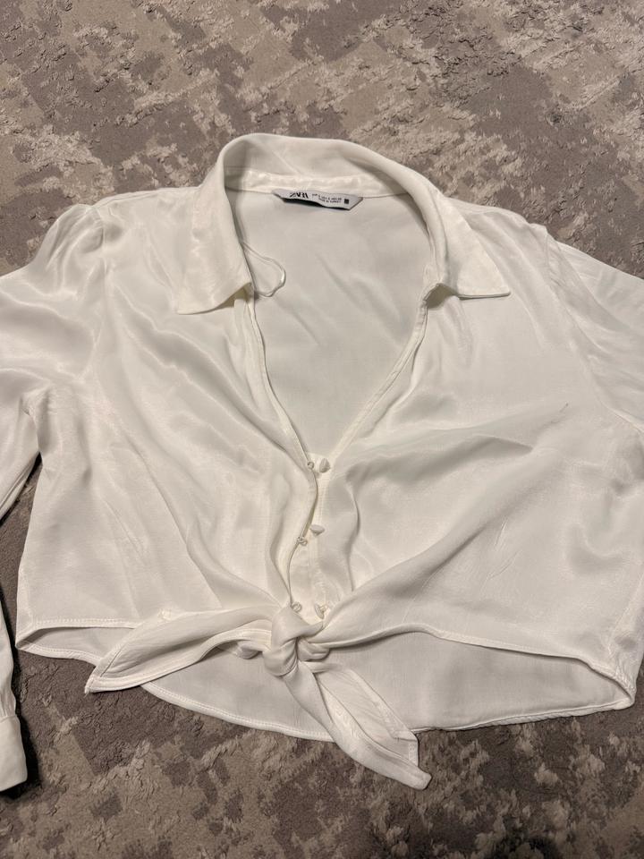 Белая укороченная блузка рубашка Zara из атласа на завязках Артикул: 599193