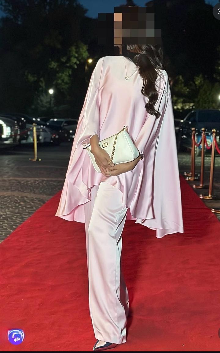 Костюм розового цвета, состоящий из свободного кейпа и классических брюк.S/M