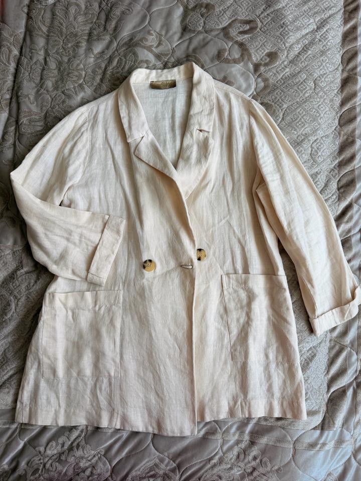 Та самая вещь, которая делает образ «дорогим» без лишних усилий 🤍 Свободный крой, натуральная фактура (похожа на лён) и мягкая посадка — идеально на тёплую погоду.Смотрится расслабленно, но при этом аккуратно и собранно.Двойной ряд пуговиц с эффектом под рог добавляет характера, а большие накладные карманы — это и удобно, и стильно.Можно носить как жакет, а можно как рубашку — отлично сочетается и с джинсами, и с платьями. Состояние хорошее. Универсальная вещь, которую будешь носить постоянно❤️ Артикул: 599386