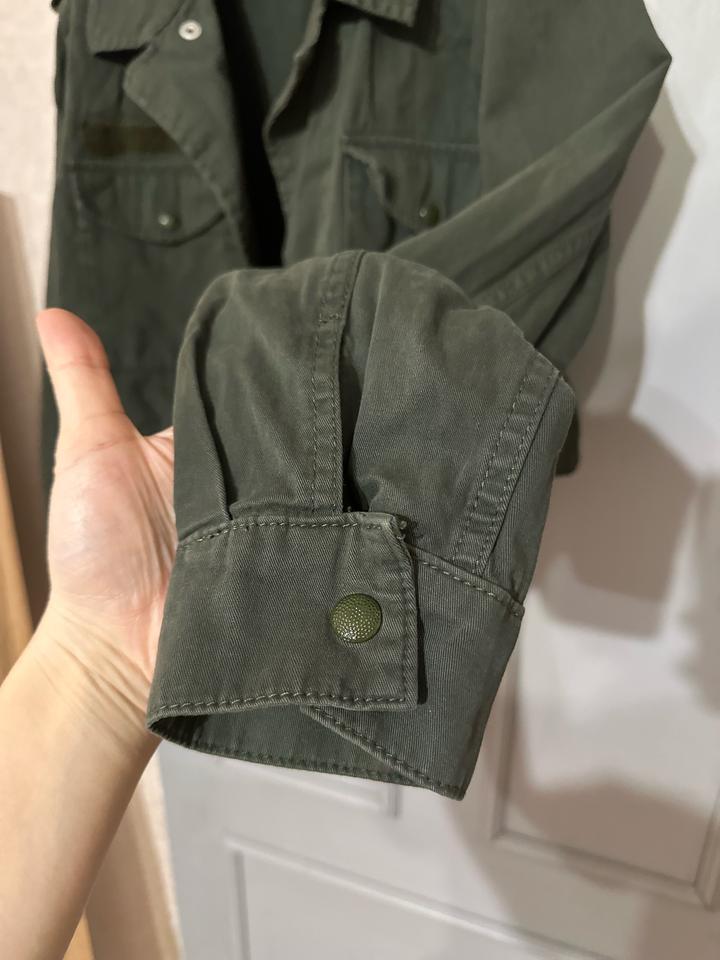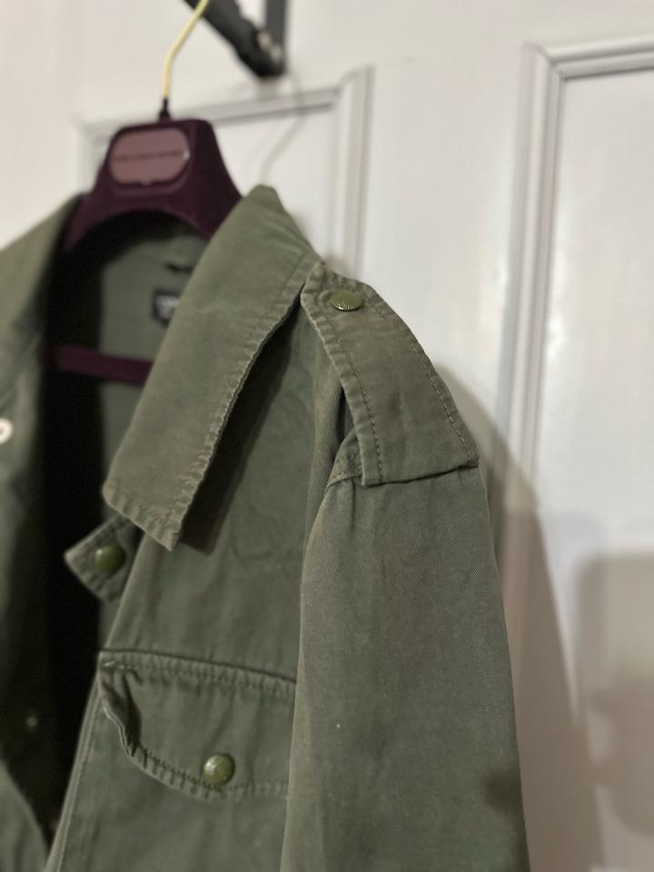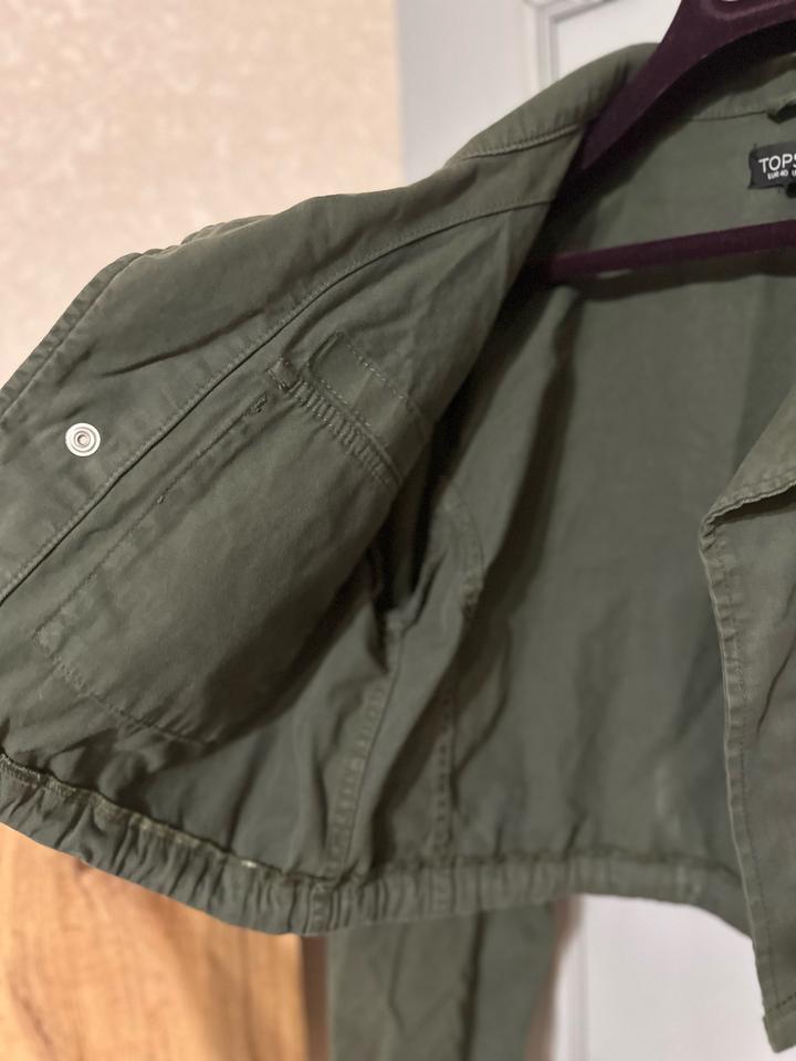 Укороченная куртка от Topshop в оттенке хаки. Модель в стиле милитари с накладными карманами и погонами. Свободный крой с регулируемой кулиской по низу подчёркивает талию. Плотная ткань держит форму, создавая структурный силуэт. Универсальная вещь для повседневных образов с джинсами, карго или платьями. Артикул: 600650