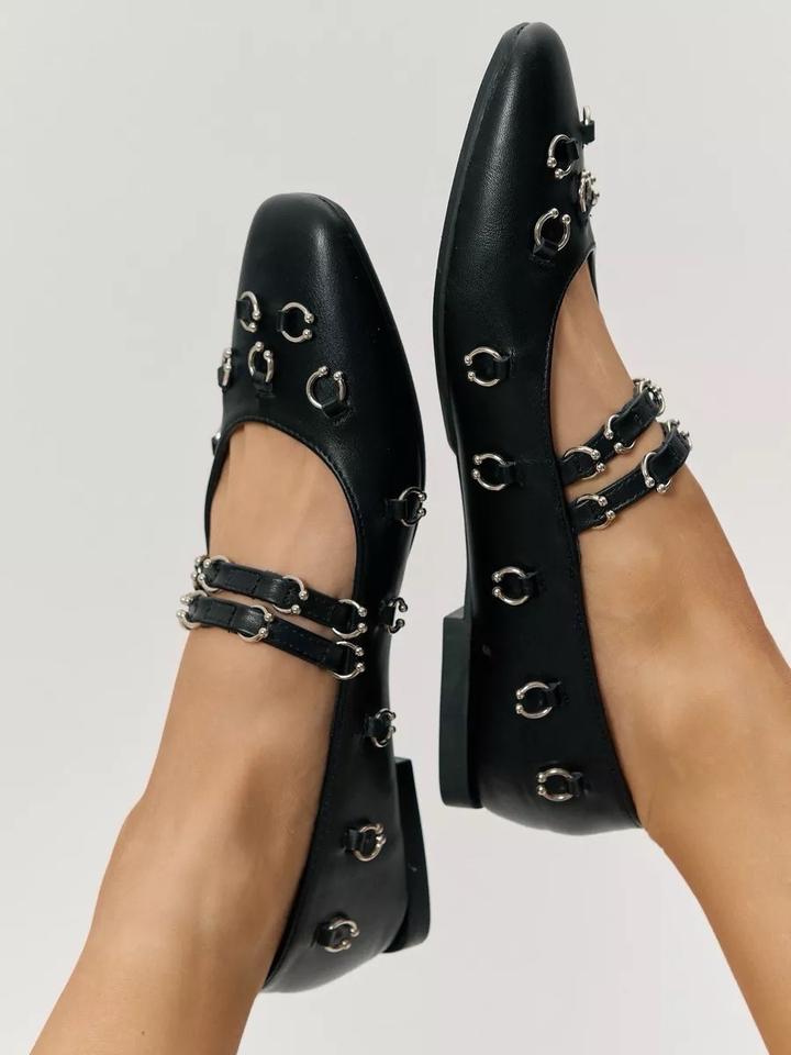 Черные кожаные балетки pierced ballerina, 100% натуральная кожа мягкая и зернистая. Декор: Металлические люверсы, создающие эффект пирсинга, и серебристая фурнитура. Покупала за 130$, носила всего пару раз, так как жмут, то есть на мой 37 размер маломерят. Думаю подойдет на размер 36-36.5. Артикул: 600686