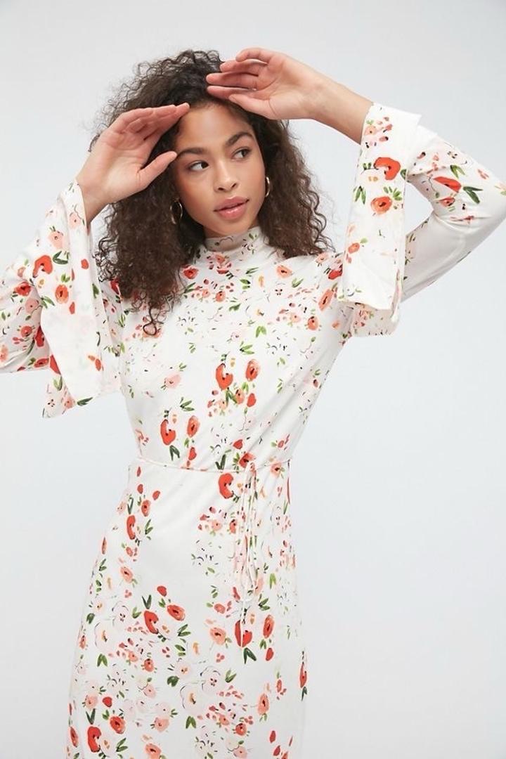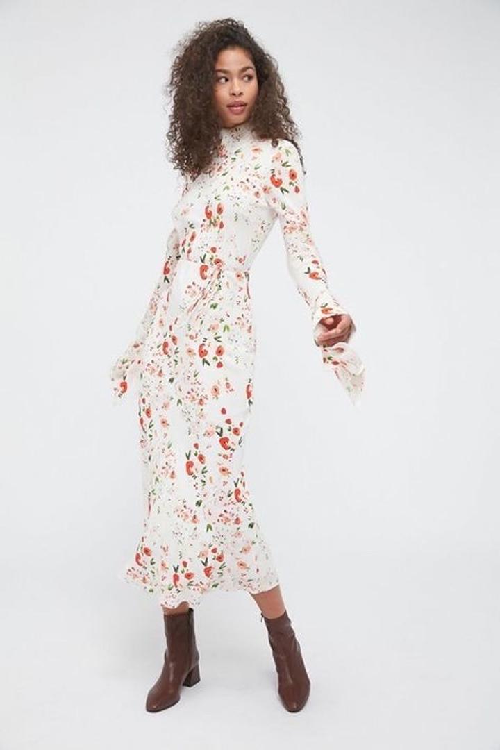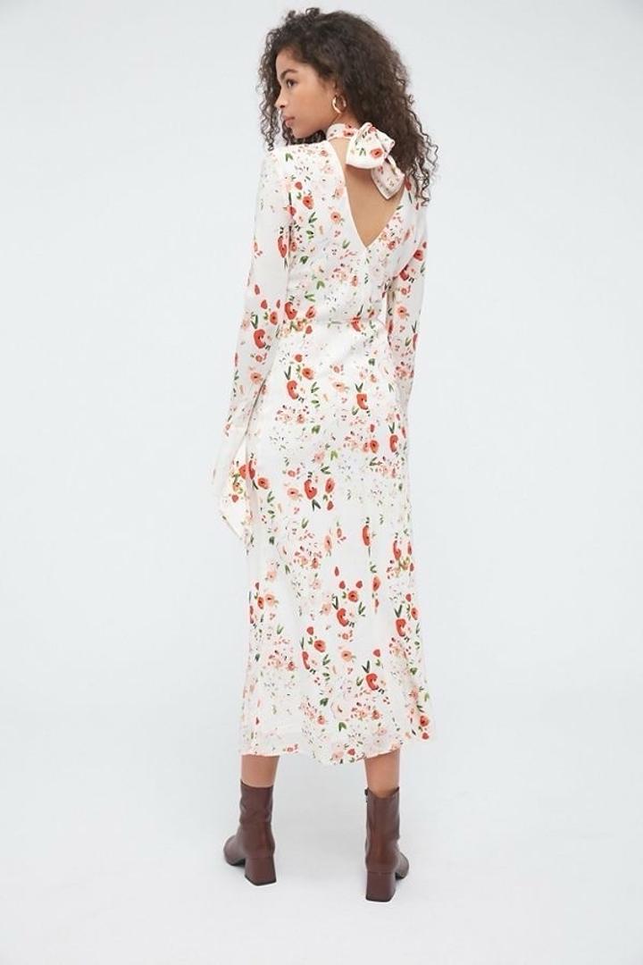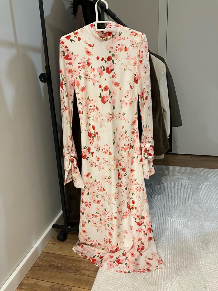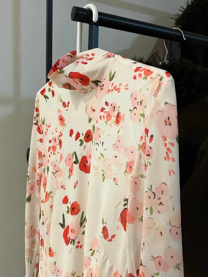 Элегантное платье миди от корейского бренда PUDRA. Нежный цветочный принт и ткань (silky viscose) приятно струится. • Крой: Раскроено по косой (bias cut), благодаря чему платье идеально садится по фигуре, подчеркивая силуэт. • Детали: Высокий воротник-стойка, изящные завязки на шее сзади и эффектные длинные рукава с разрезами на манжетах (split bell cuffs). Артикул: 600765