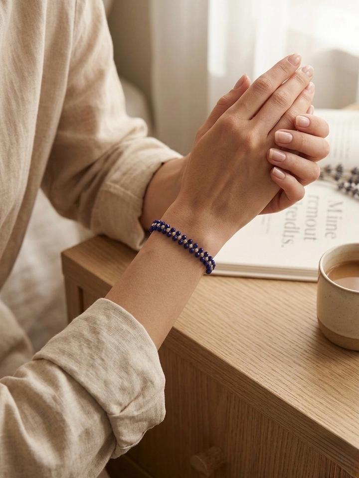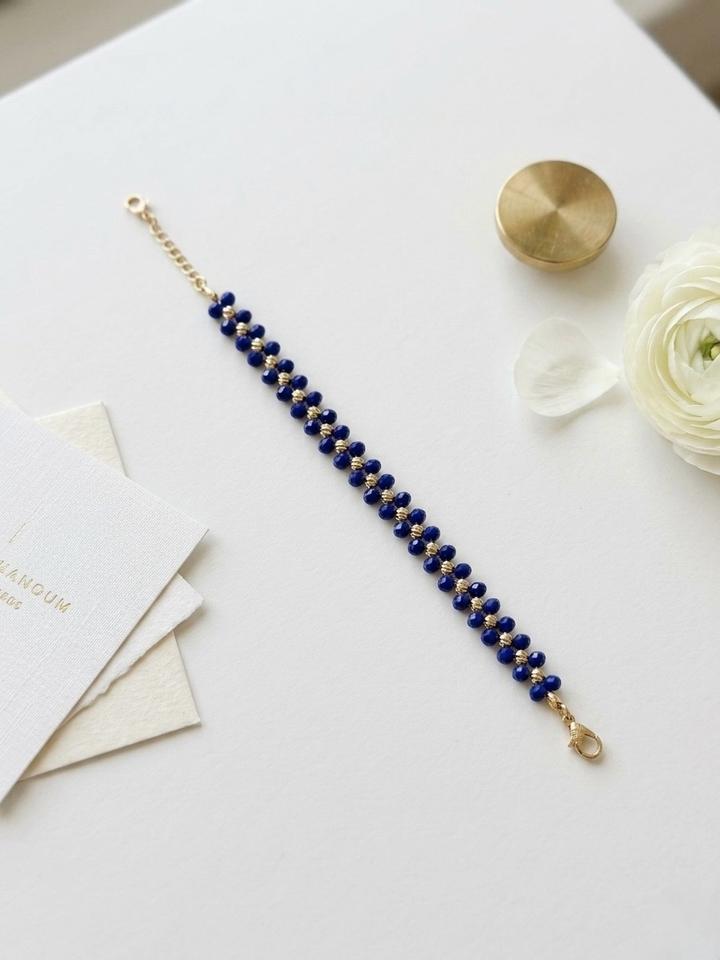 Элегантный браслет из синих граненых бусин с золотистыми разделителями на регулируемом шнурке. Тонкая ручная работа, которая подчеркнет изящество вашего запястья. Ключевые преимущества для описания: • Эстетика: классическое сочетание синего и золотого. • Легкость: комфортно ощущается на руке в течение всего дня. Артикул: 601425