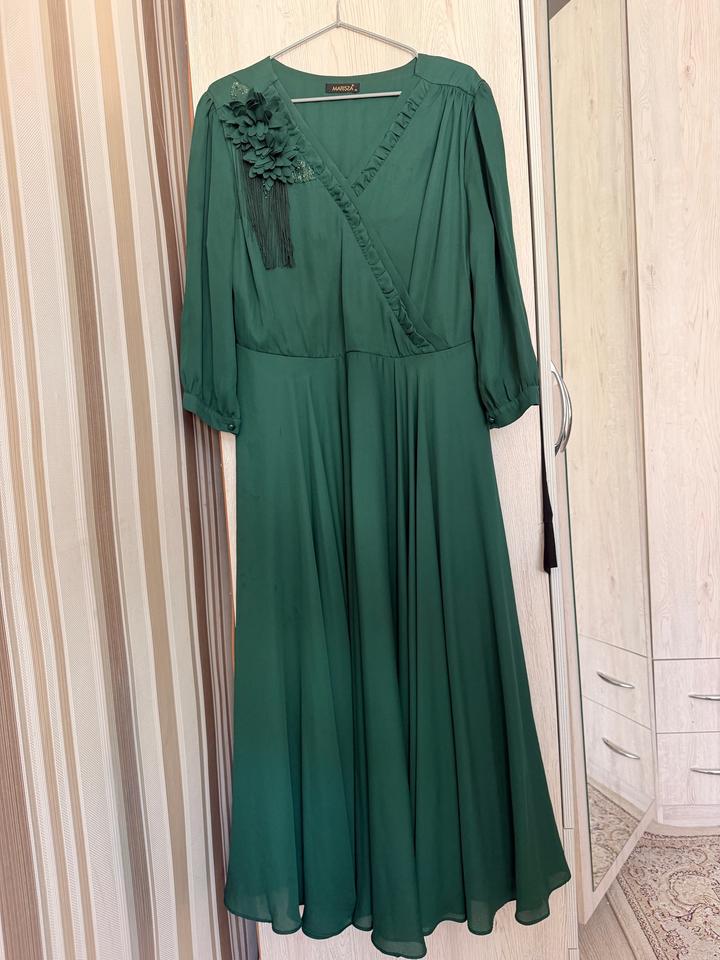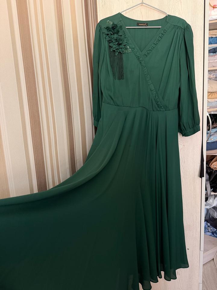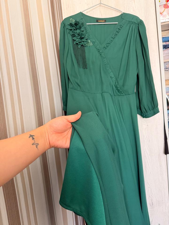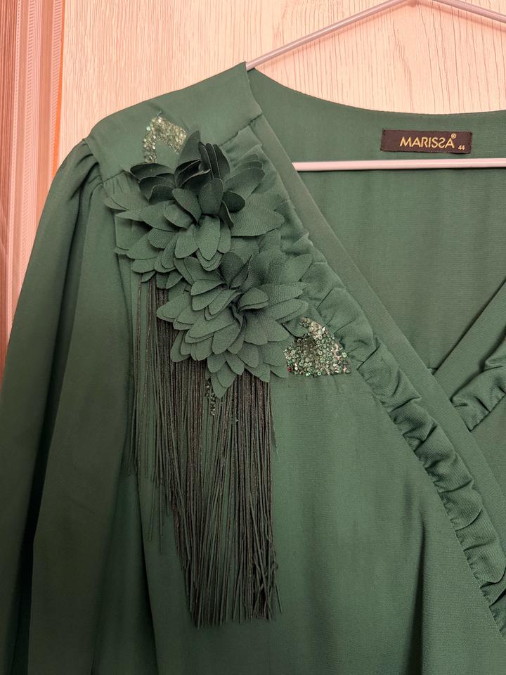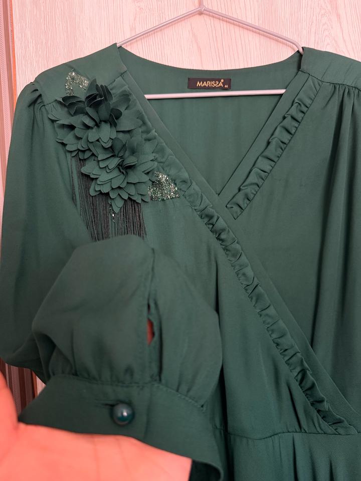 Очень стильное и необычное платье в красивом тёмно-зелёном оттенке 🌿 Смотрится дорого за счёт декора и аккуратного кроя * лёгкая струящаяся ткань (шифон) * есть подклад — не просвечивает * V-образный вырез с аккуратной отделкой * декоративные рюши по линии запаха * оригинальный декор: цветы + бахрома + бисер * юбка свободная, красиво струится ✔️ Смотрится очень женственно и нарядно ✔️ Отлично подойдёт на той, праздник, мероприятие ✔️ Подчёркивает фигуру и скрывает лишнее😏 Артикул: 601440