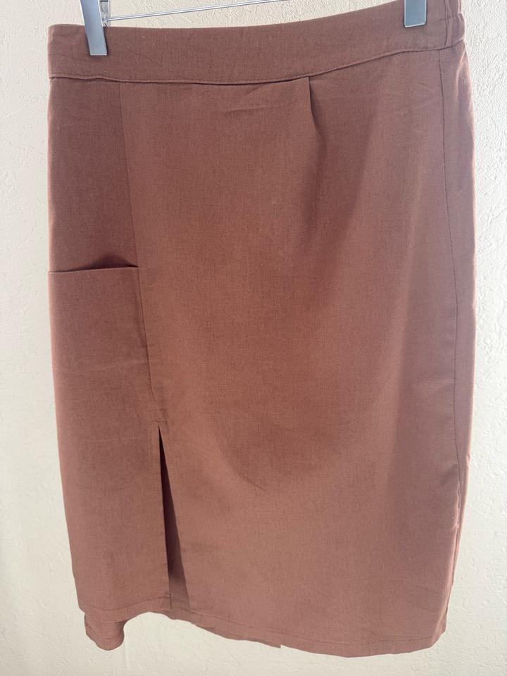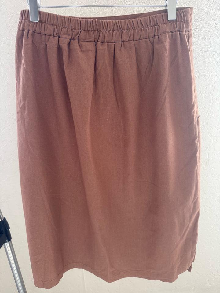 Юбка коричневого цвета, легкая, удобная, пояс на резинке. Впереди небольшой карманчик и шлица. Артикул: 601464