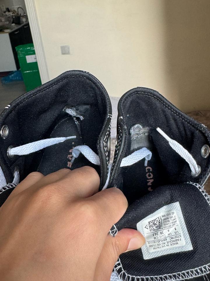 Продам конверсы , оригинал. Покупали в момсбокс. Внутри порвался, где задняя косточка. Можно заклеить или зашить как то. Снаружи все норм. Размер на фото. И дефект тоже есть на фото , но норм не снялось. Продаю , так как стоит. Артикул: 601496