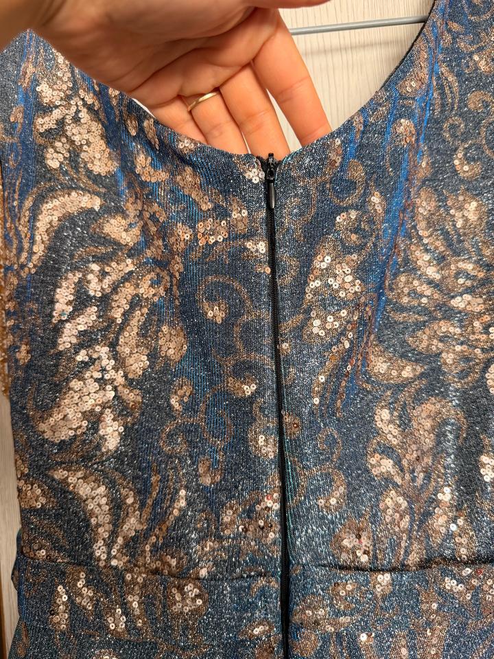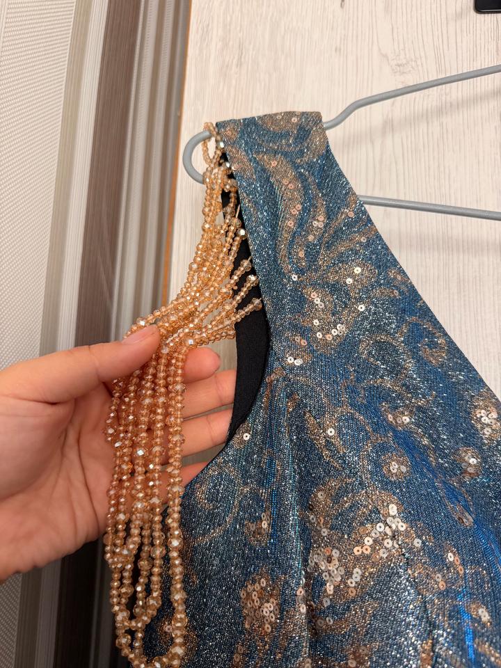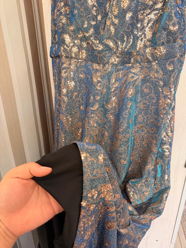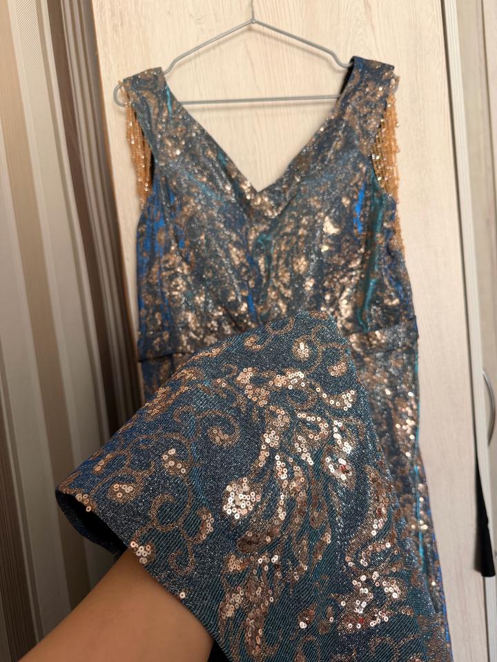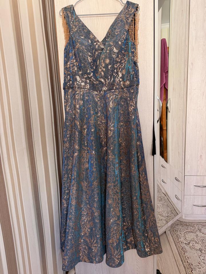 Роскошное платье с эффектным блеском — идеально для торжеств, свадеб, выпускных и важных мероприятий 💫 * плотная дорогая ткань с пайетками и узором * красивый V-вырез * акцент на плечах — декоративные кисти (очень эффектно смотрятся при движении) * держит форму, не выглядит дешево * подклад внутри — комфортно носить * приталенный верх + расклешённая юбка ✔️ Очень нарядное, «дорого выглядит» ✔️ Подчеркивает фигуру ✔️ Не требует сложных аксессуаров 🔹 Состояние: почти новое (надевалось всего 2 раза) Артикул: 601501