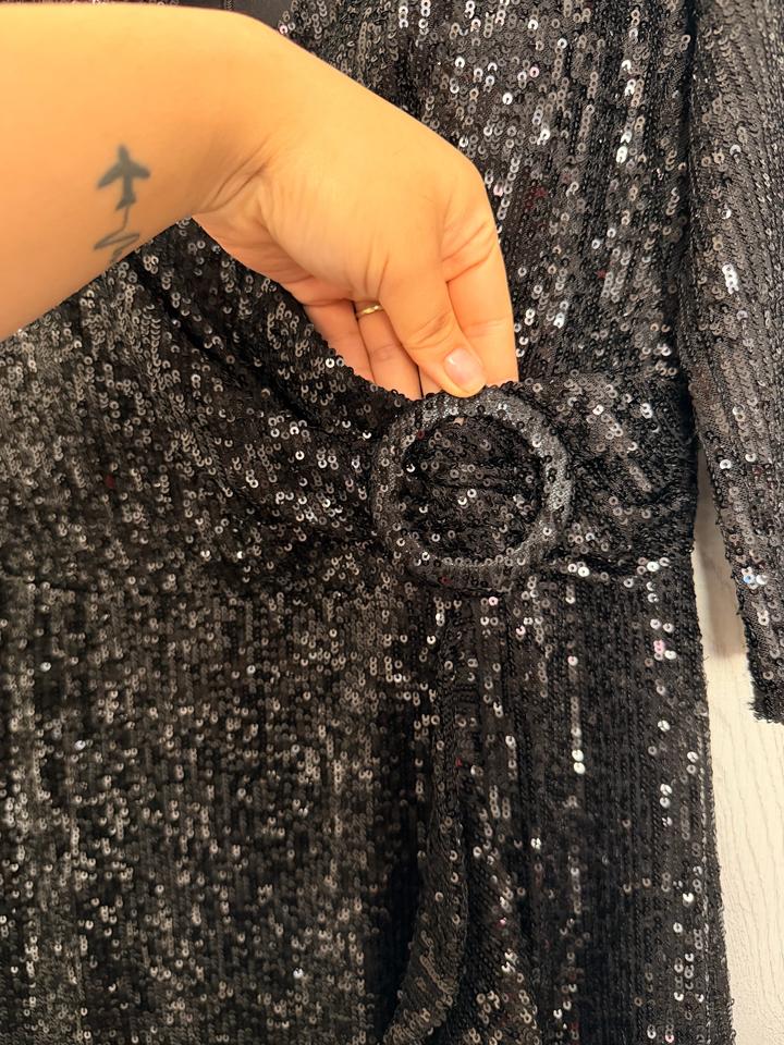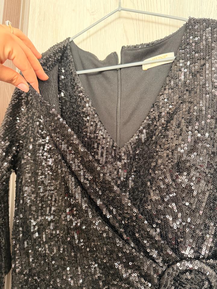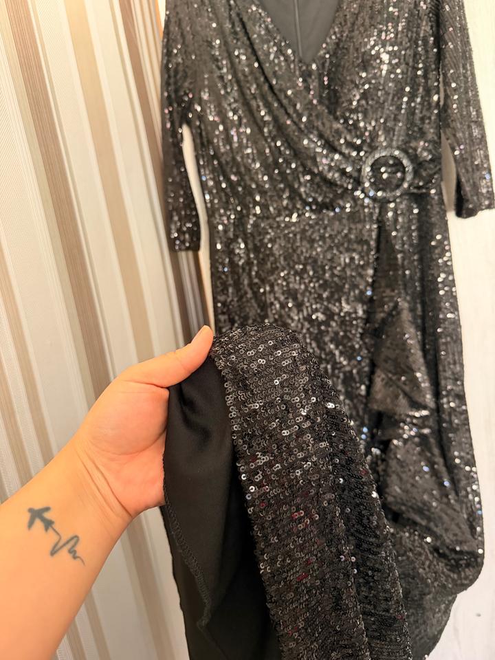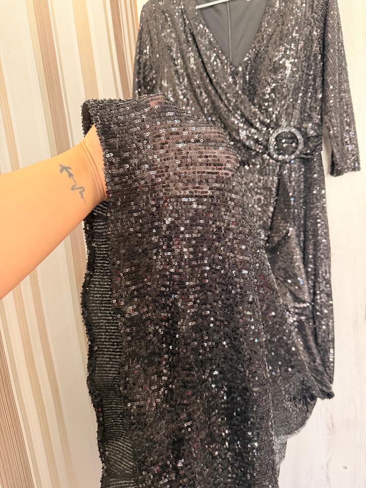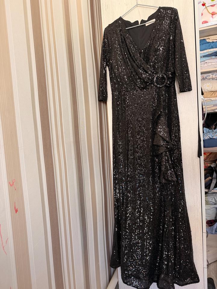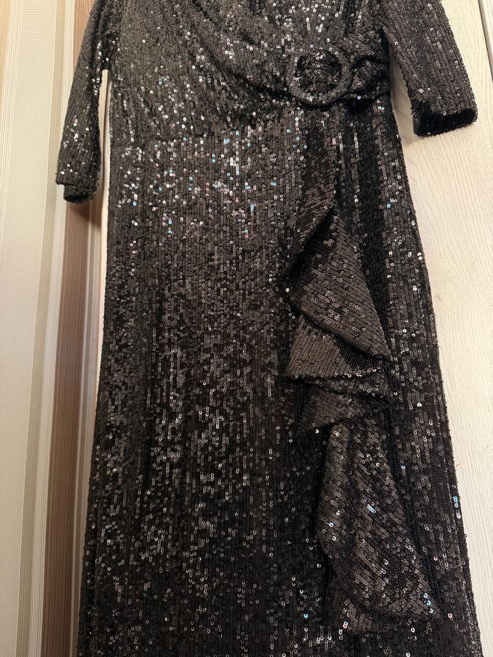 Эффектное чёрное платье с пайетками — идеальный вариант для мероприятий, праздников и вечеринок 💫 ▪️ Полностью усыпано пайетками, красиво переливается при свете ▪️ Очень мягкое и комфортное — не колется, приятное к телу ▪️ Элегантный V-образный вырез ▪️ Длина макси ▪️ Рукав 3/4 ▪️ Акцент на талии с декоративным элементом ▪️ Есть подклад — не просвечивает 📌 Состояние: отличное, носили аккуратно Отлично подойдёт на: свадьбу, корпоратив, торжество, фотосессию Артикул: 601523