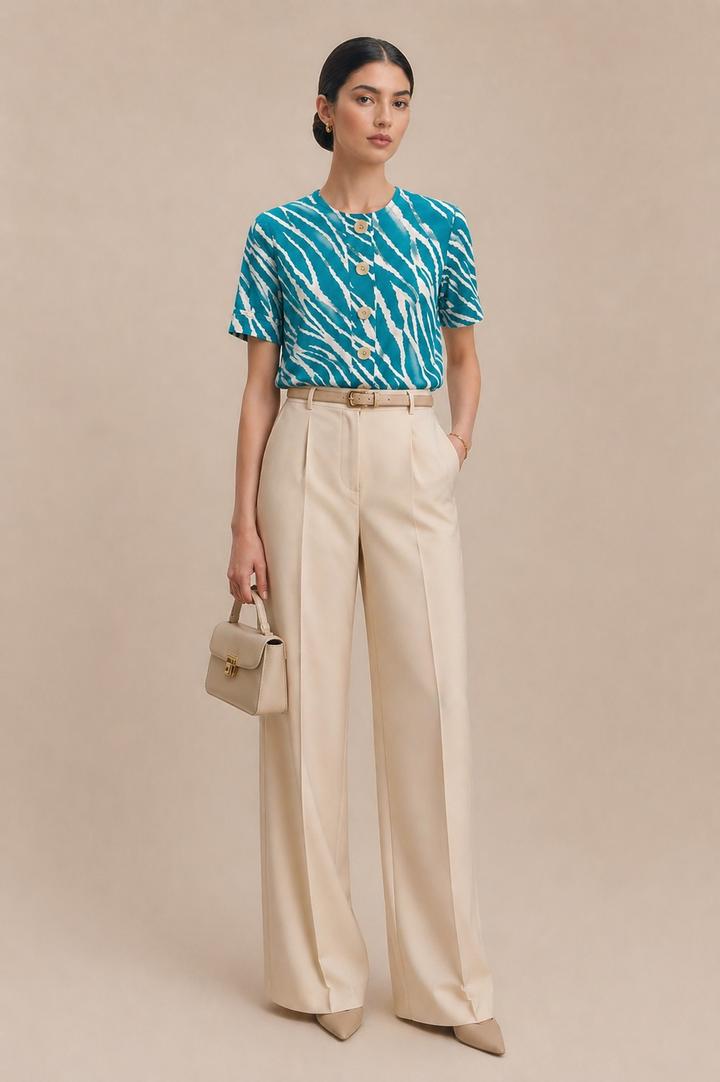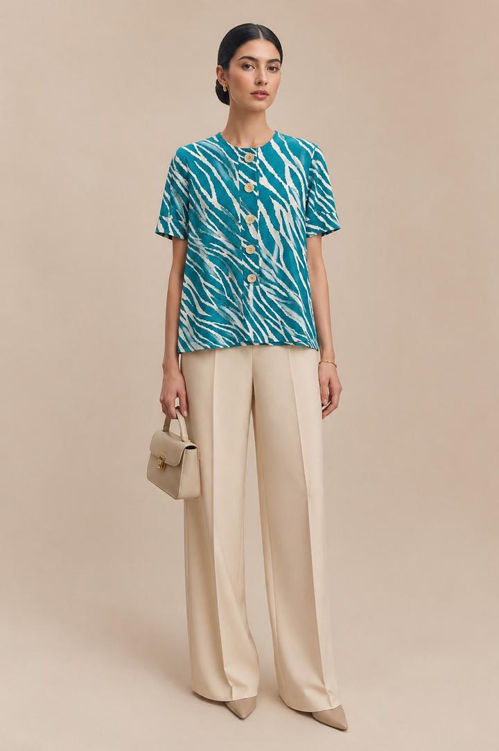 Бирюзовая блуза с выразительным графичным принтом в духе Yves Saint Laurent утончённый акцент гардероба в эстетике quiet luxury. Лаконичный крой, акцентные пуговицы и чистая линия силуэта, аккомпанируемая подплечниками (при желании из можно удалить) создают ощущение продуманной элегантности и статуса. Идеальна для безупречных образов с характером. Артикул: 601584