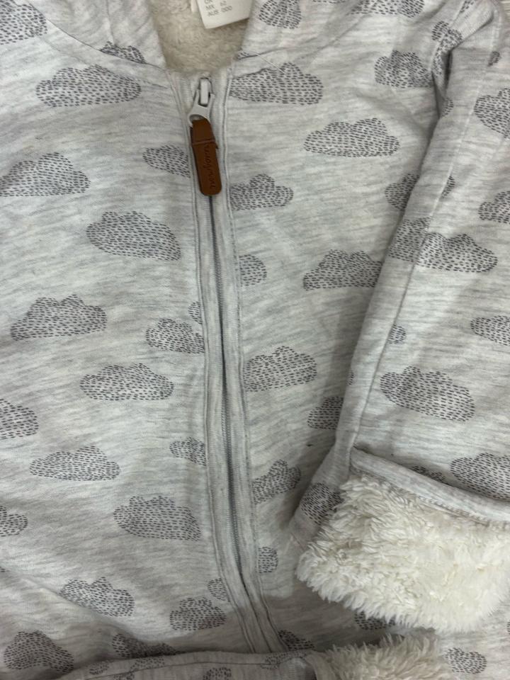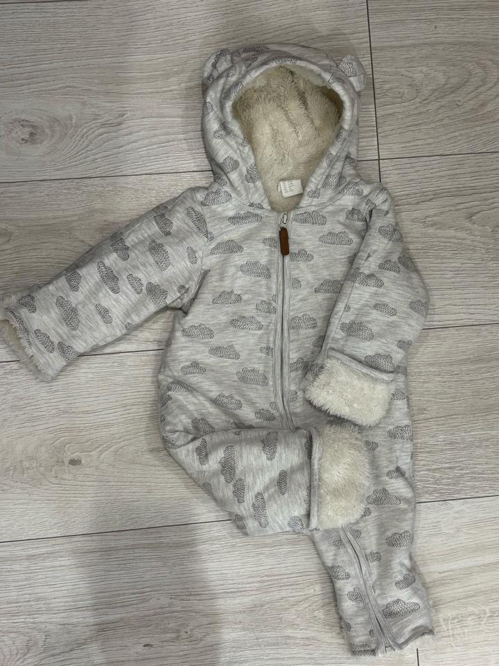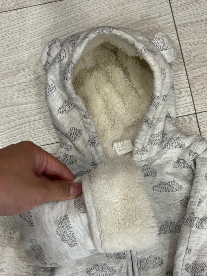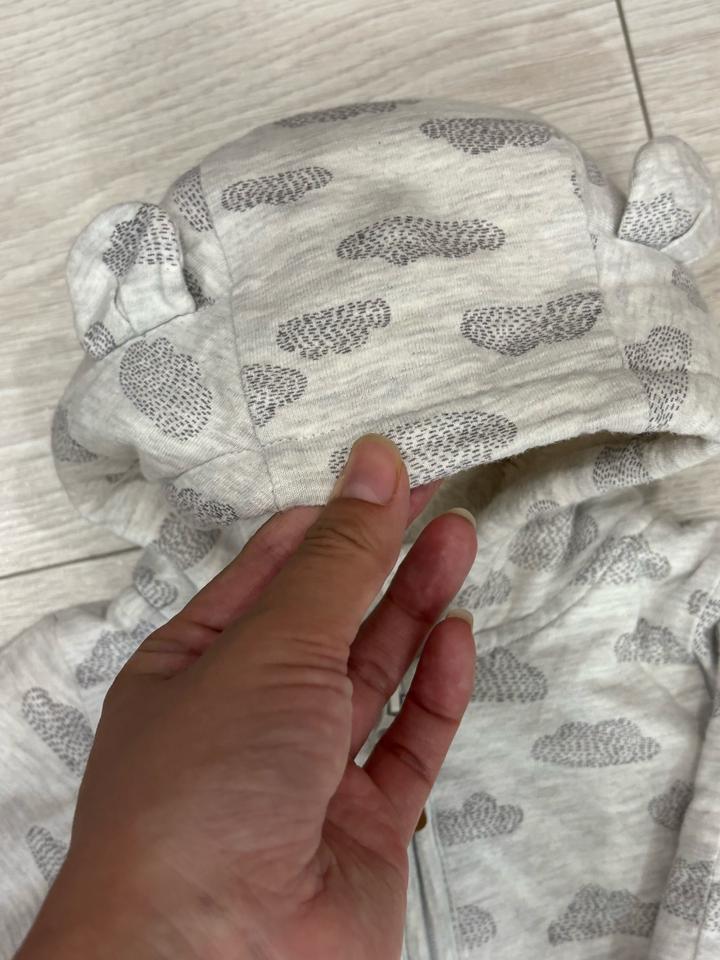 Комбинезон на прохладное лето, теплую весну , осень и в помещении снаружи органический Коттон , внутри пенка мягкая как облачко за поперечном замке, капюшон с ушками и подкладом очень милый, принт облачка на сером фоне , унисекс , ручки ножки отвернуть можно для удобства в хорошем состоянии носили мало Артикул: 601742