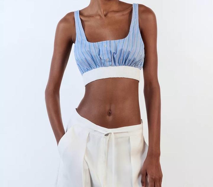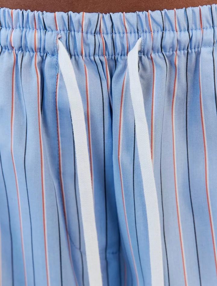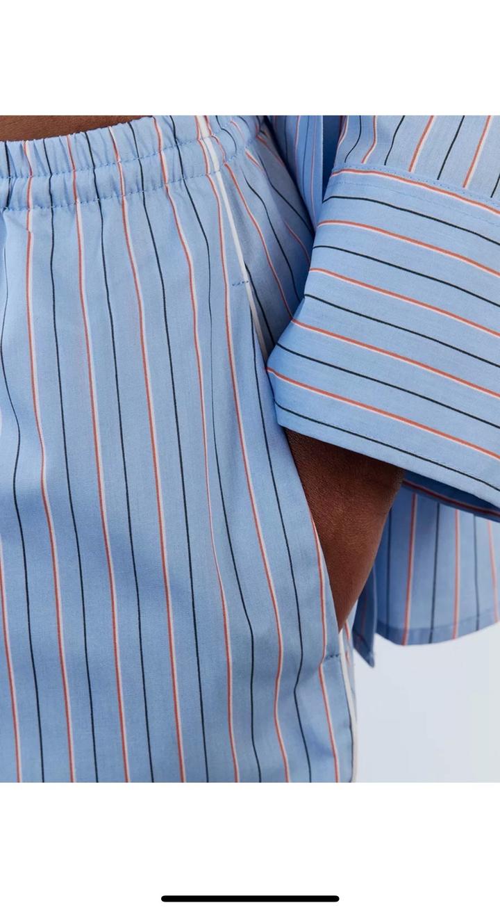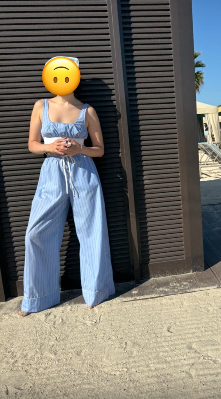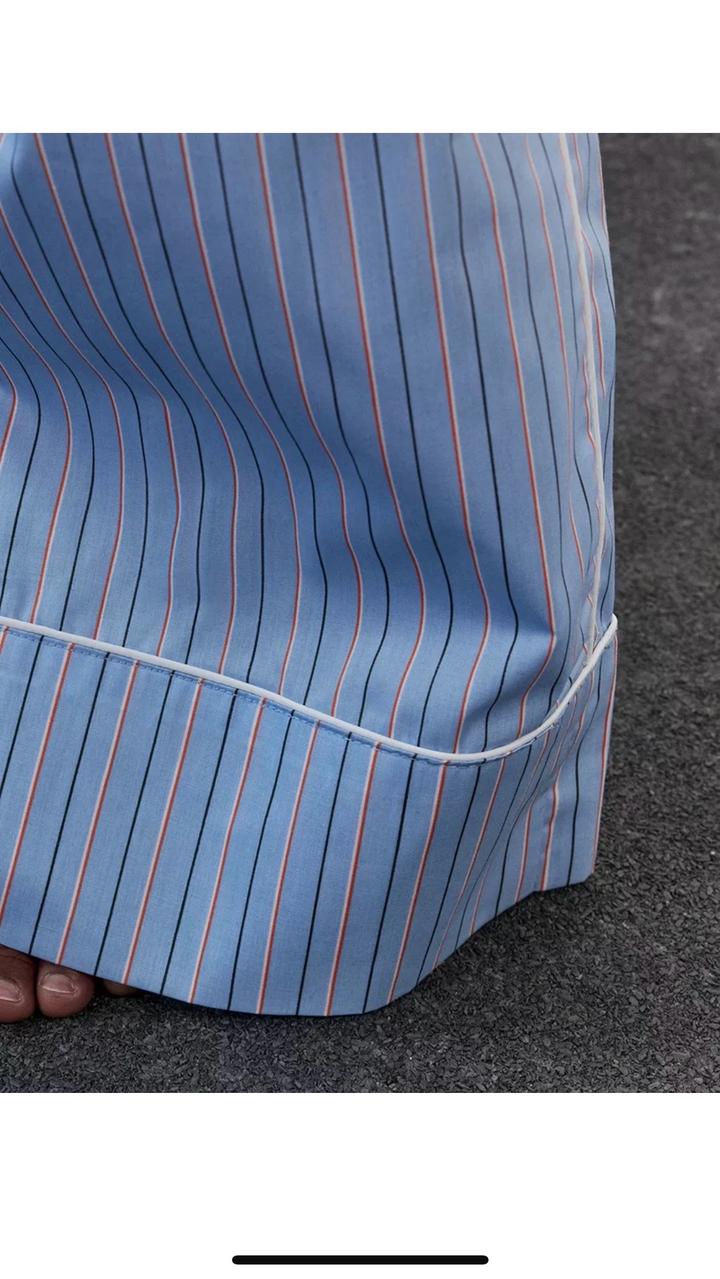 Пляжный комплект ( брюки и топ) в пижамном стиле. 1) Брюки широкие, тонкий пояс-резинка на завязках, 2 боковых кармана. 2)Топ укороченный на широких бретелях, декоративные пуговицы на груди, по низу эластичная резинка. Комплект из хлопка, в голубом цвете в полоску. Размер : S ( ОГ 90-95) Эффектный, стильный и комфортный! Состояние хорошее Артикул: 601775