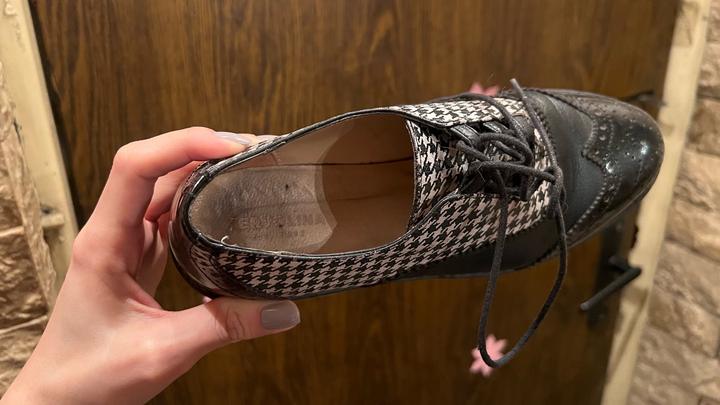 Дерби с принтом «Гусиная лапка» Очень стильные, люблю их дизайн. Под любой образ Но стали малы, натирают теперь Сам по себе материал очень плотный, жесткие боковины Подошва приятная, упругая В отличном состоянии Артикул: 601910