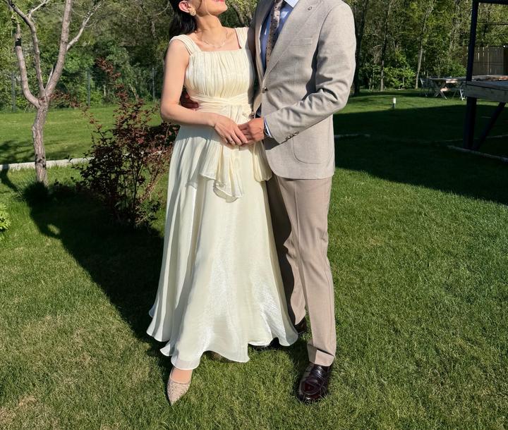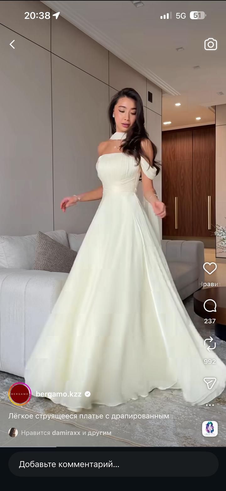 Нарядное красивое платье в сливочном цвете. Материал очень красивый блестит. Надевалось всего на пару часов. Отлично подходит как выпускницам так и девушкам в положении🤰🏻за счет корсета. На мне чуть по другому смотрится из-за 🤰🏻 С шарфиком идет вместе, по желанию можете использовать. Артикул: 601952
