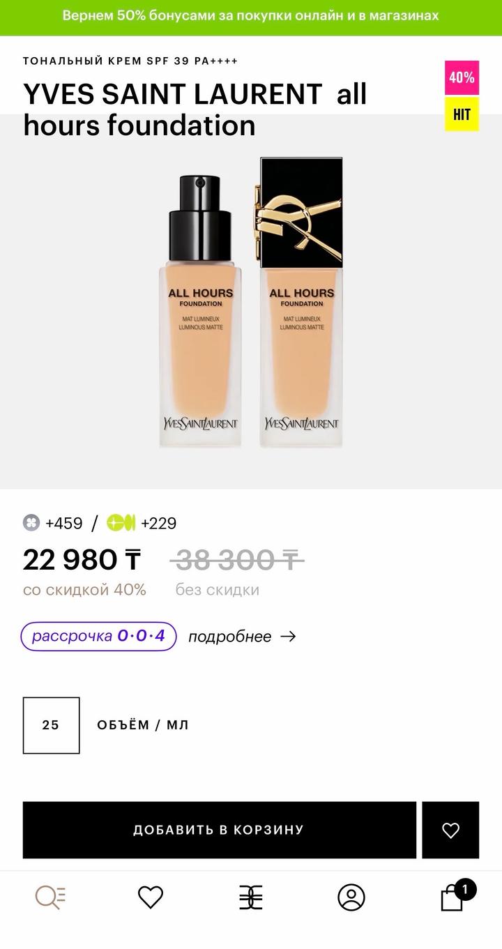 Продам матирующий тональный крем от YvesSaintLaurent All hours foundation, тон MN4, мне не подошел тон .Куплен в Золотом яблоке в январе, отдам за 18000 тг. Артикул: 601964