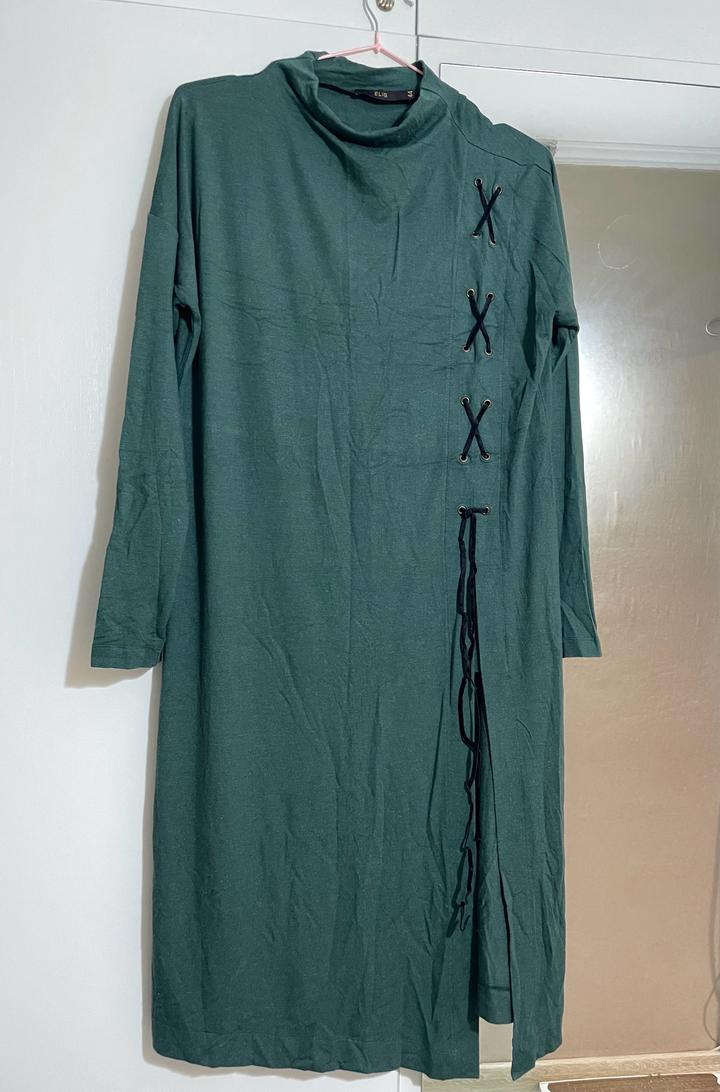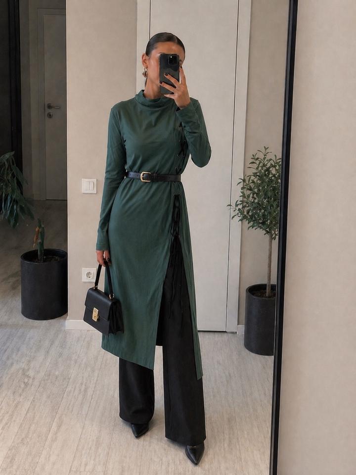 Стильная удлинённая туника насыщенного зелёного цвета. Модель с высоким боковым разрезом и декоративной шнуровкой — выглядит интересно и современно. Состояние: отличное Размер: 44 (подойдёт на S–M) Ткань: мягкая, комфортная к телу Артикул: 602272