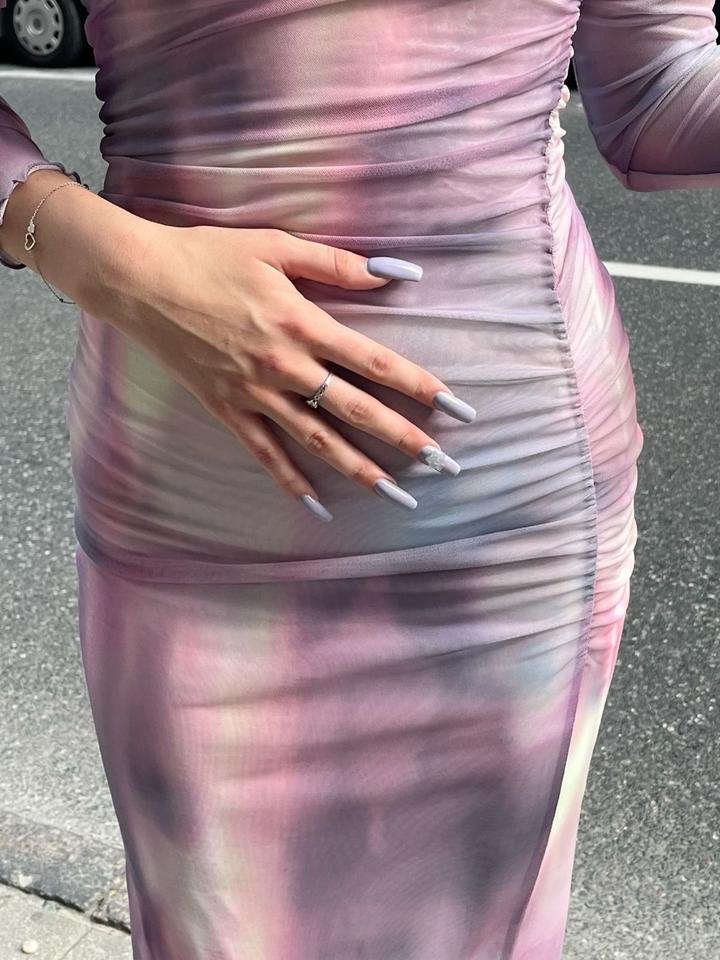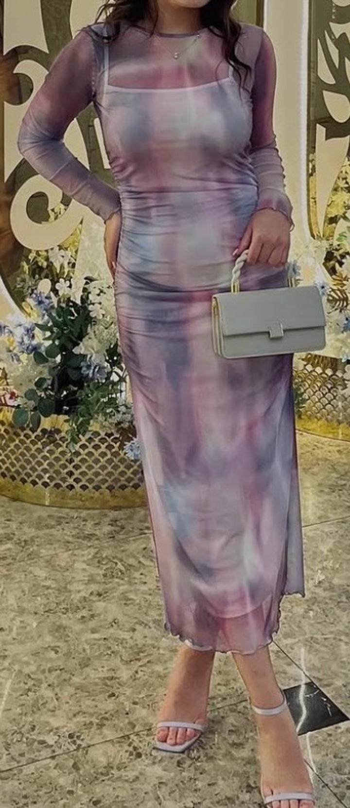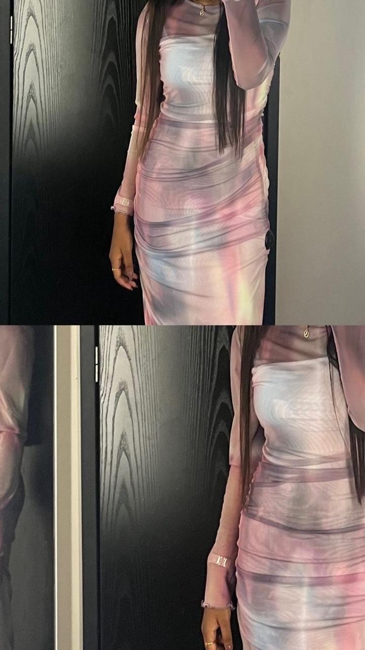 Платье H&M Облегающее платье миди/макси из мягкой сетчатой ткани. Нежный розово-сиреневый принт с эффектом «мрамора». Длинные рукава, хорошо тянется, красиво подчеркивает фигуру. Надевалось всего 1 раз, состояние как новое. Подойдёт на выход, мероприятие или фотосессию.Размер: подойдёт на M–L Артикул: 602314