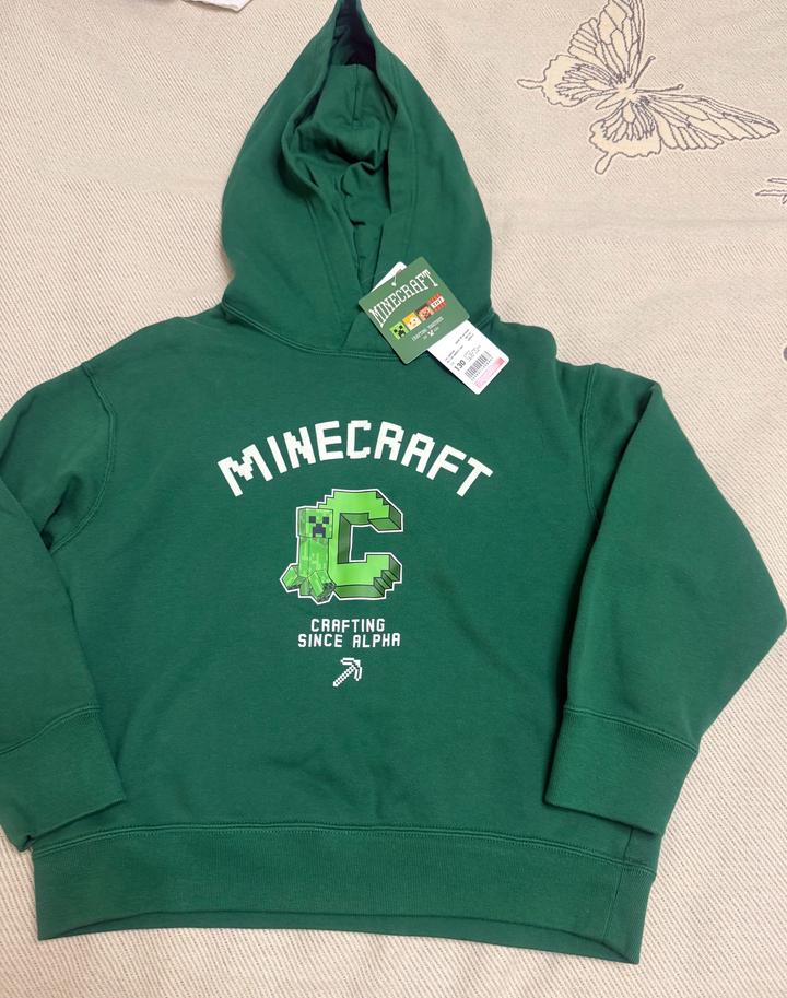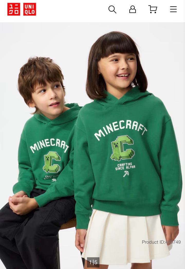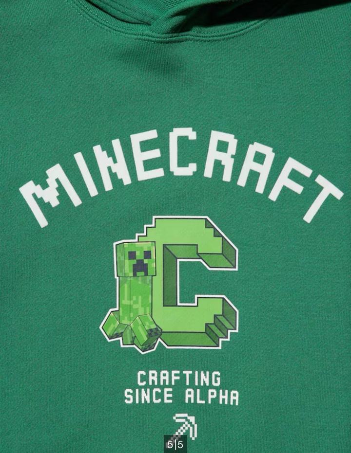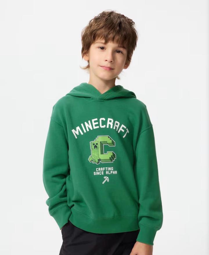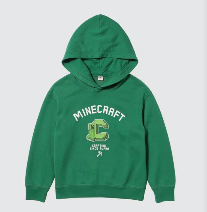 детское худи зеленого цвета с символикой популярной игры Minecraft. Это официальная коллаборация Minecraft с известным японским брендом Uniqlo из их популярной линейки футболок и толстовок с принтами UT (Uniqlo T-shirt).Дизайн: По центру расположена большая стилизованная буква «C» в стиле колледжа, внутри которой изображен знаменитый персонаж игры — Крипер (Creeper). Сверху нанесена надпись «MINECRAFT», а снизу — «CRAFTING SINCE ALPHA» и пиксельная кирка. Артикул: 602431